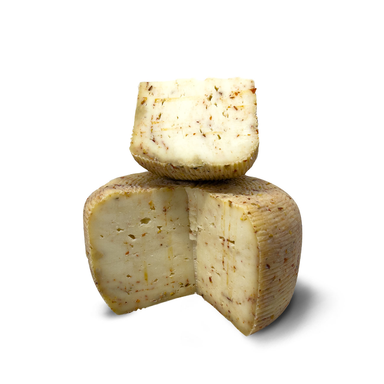 Formaggio misto ovino e vaccino locale a pasta semi-dura, arricchito con scaglie di peperoncino calabrese. Morbido e leggermente friabile, unisce la dolcezza del latte al carattere piccante e aromatico, per un gusto intenso e sorprendente.